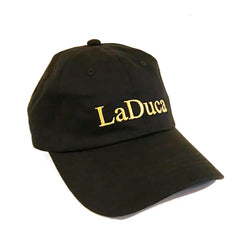 A black baseball cap with the LaDuca Logo on the front and the LaDuca Flexible Shoe Icon on the back.